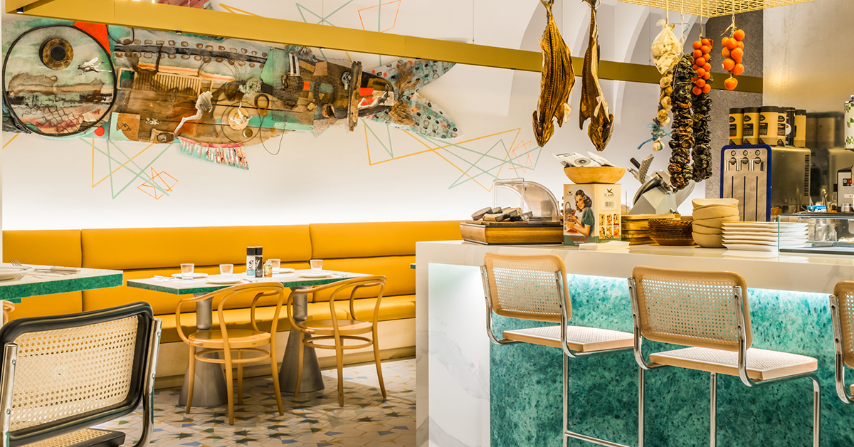 Pero me gustaría destacar nuestro proyecto más reciente con Serawa Hotels y Green Geometric Architects, ya que es increíble ver el potencial de un material hecho de redes de pesca recuperadas de mares y puertos, el cual mencioné antes y que hemos nombrado Gravitec. En este proyecto para Serawa Hotels hemos podido reinventar la vida útil de las redes de pesca descartadas en un espacio gastronómico único, utilizando nuestros materiales que evocan los colores del mar, cuentan una historia y se adaptan perfectamente a este proyecto de interiorismo.