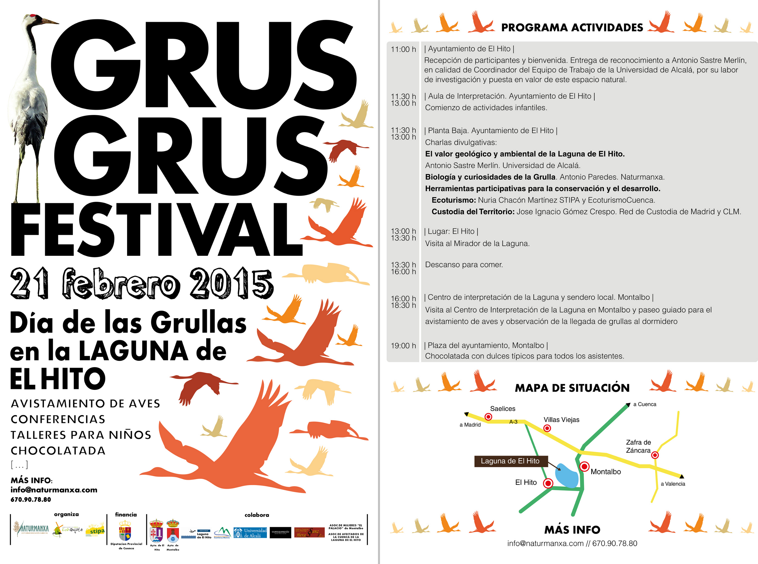 El sábado 21 de febrero las localidades de El Hito y Montalbo acogerán la celebración de la primera edición del Grus Grus Festival - Día de las Grullas, un evento concebido para tener una periodicidad anual y que sirva como atracción turística de uno de los humedales más importantes de la provincia de Cuenca: la Laguna de El Hito.