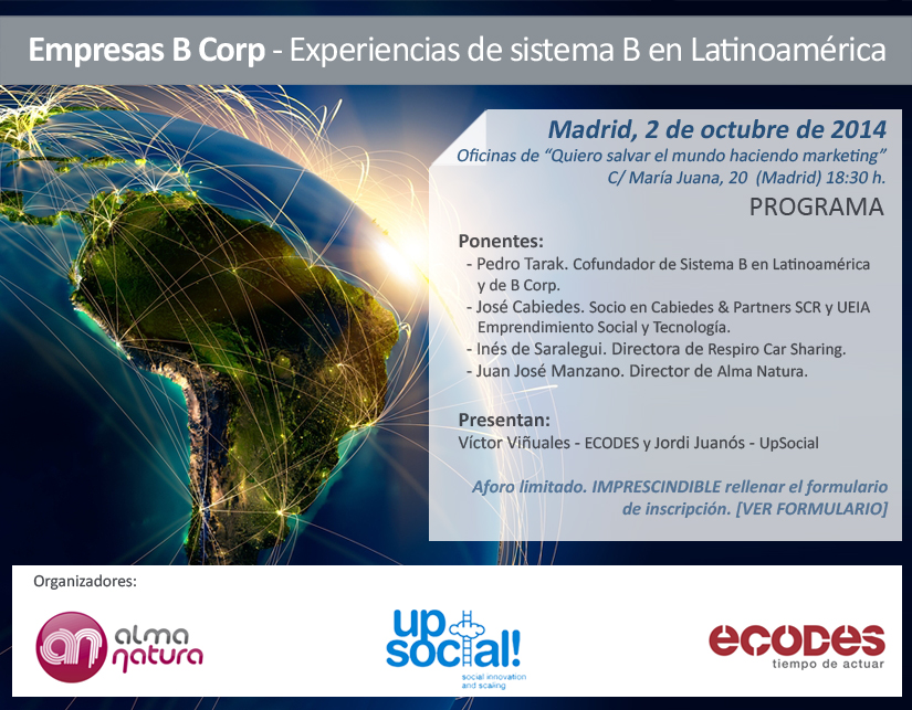 Hoy jueves 2 de octubre tendrá lugar en Madrid un encuentro con el cofundador de Sistema B, Pedro Tarak, para hablar sobre la experiencia de las B Corp en América Latina y analizar las perspectivas para España.