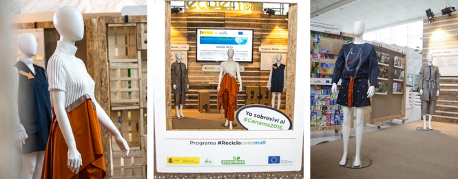 En el Espacio Ecoembes se pudo visitar la exposición de trajes fabricados a partir de envases reciclados de Ecoembes por Moisés Nieto. Una colección creada en un 80% con tejidos elaborados a partir de materiales reciclados, principalmente botellas de plástico.