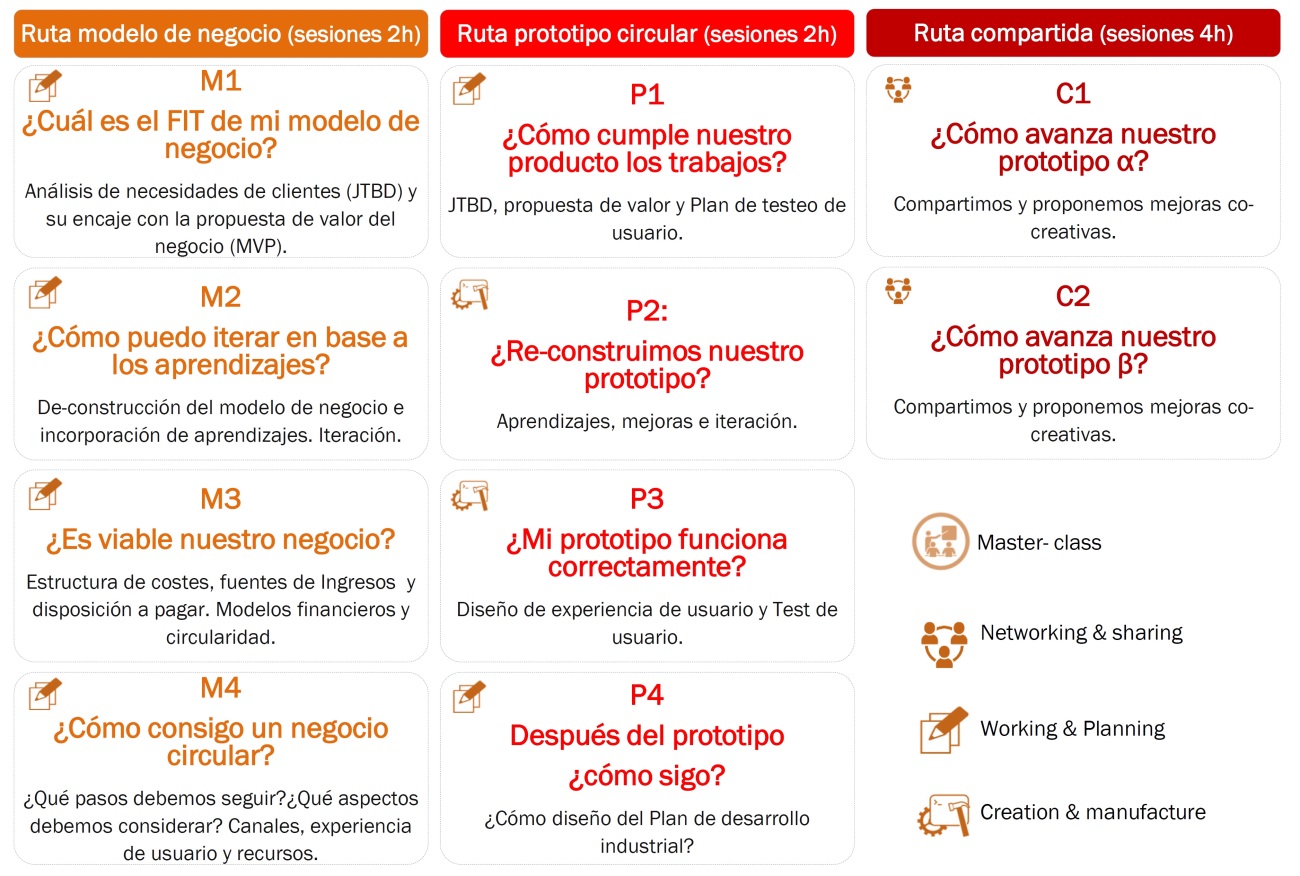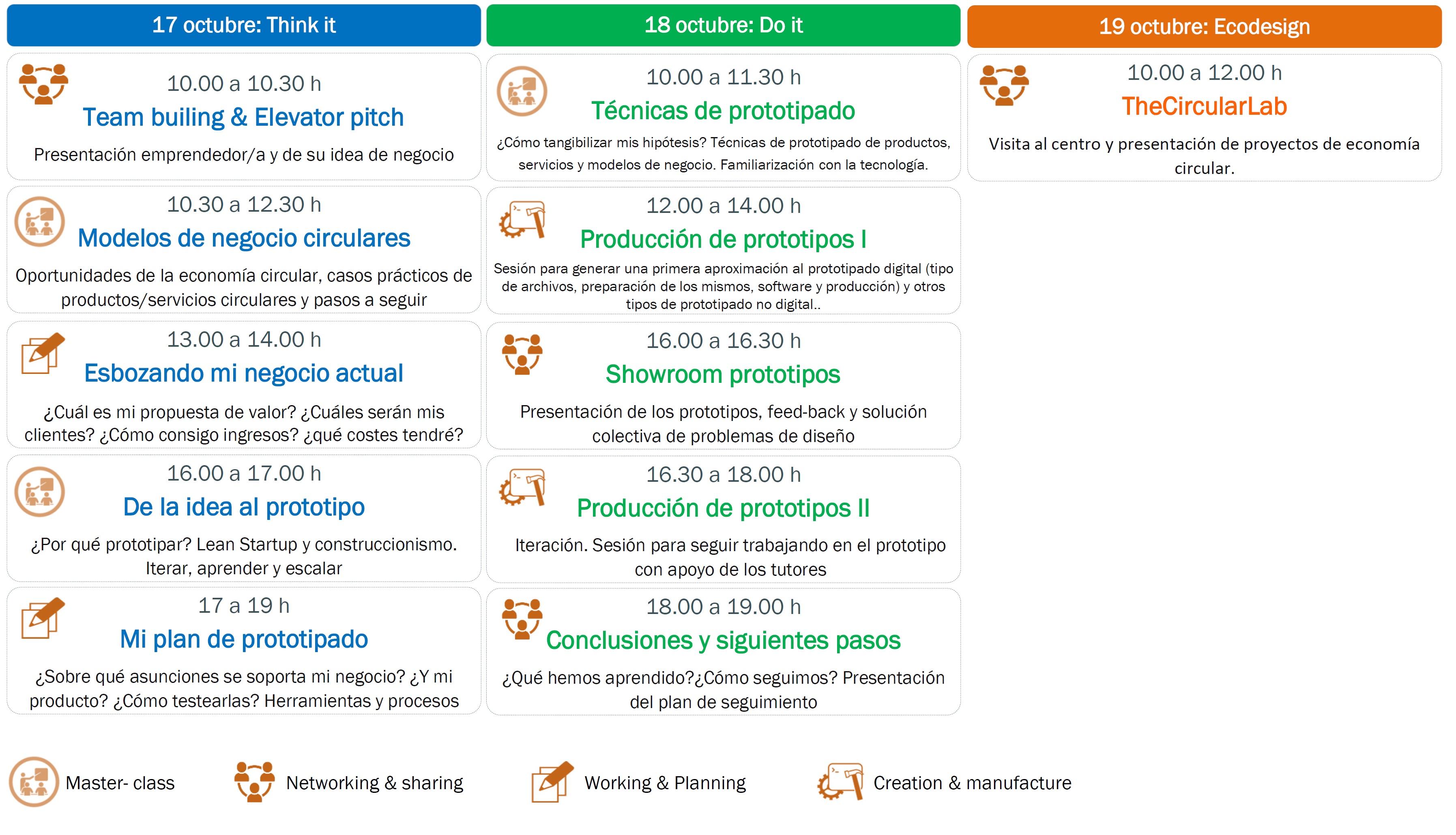 El 17, 18 y 19 de octubre, el programa #PrototipaCircular llevará a cabo un taller intensivo de formación práctica en las instalaciones de TheCircularLab de Ecoembes, un laboratorio de innovación pionero a nivel europeo, ubicado en Logroño. La organización cubre los gastos de alojamiento de los participantes. Durante estas jornadas se llevarán a cabo talleres focalizados en el prototipado de productos y servicios circulares y en la creación de empresas.