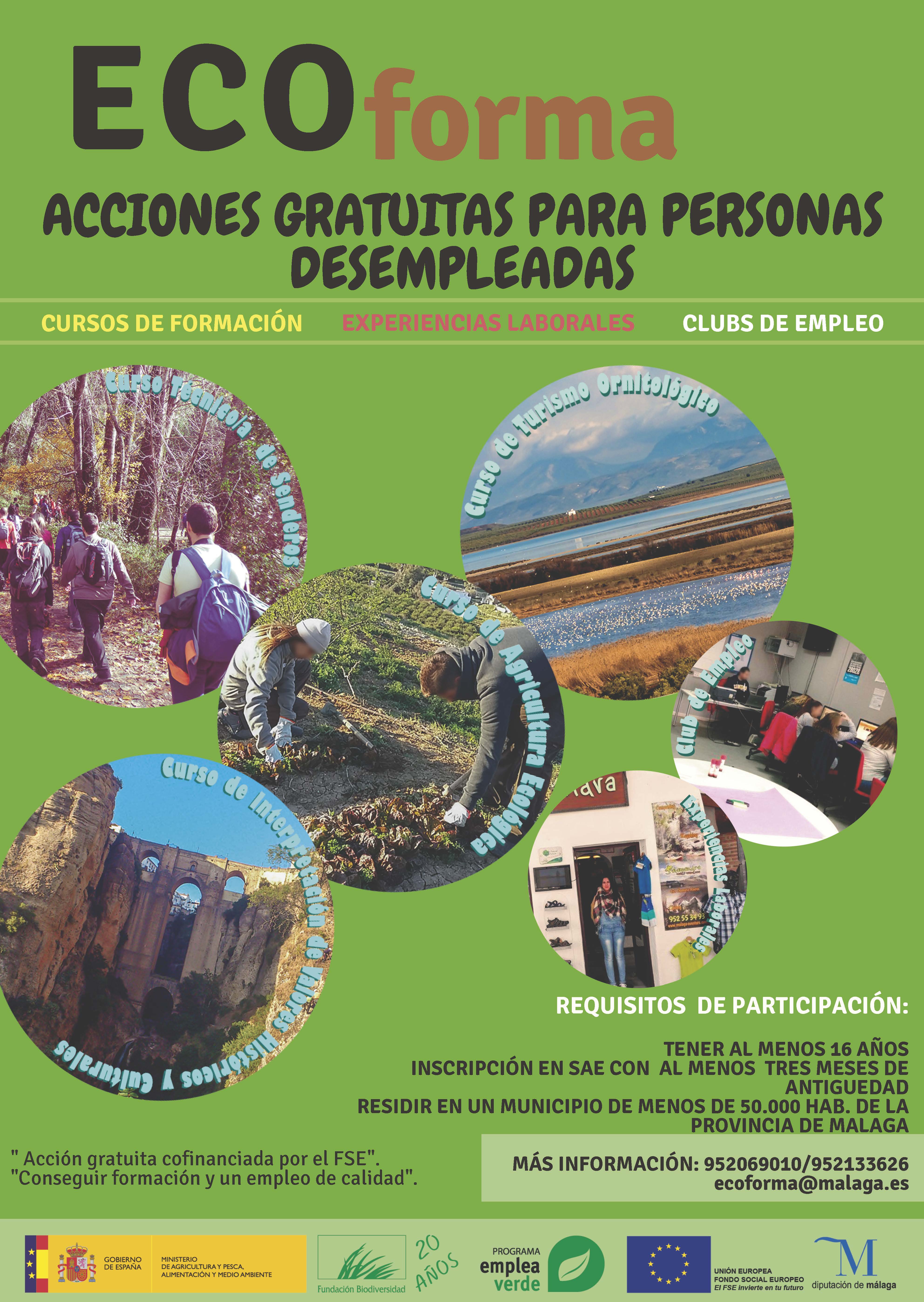 Desde el Servicio de Recursos Europeos de la Diputación de Málaga se ha puesto en marcha el proyecto ECOFORMA para fomentar la creación de empleo vinculado a la economía verde de 140 desempleados de los municipios de las provincias de Málaga y Cuenca menores de 50.000 habitantes y, en especial, de los menores de 20.000 a través de la formación y la innovación social. Para ello han puesto en marcha los Clubs de Empleo y Economía Social y las Experiencias de trabajo.