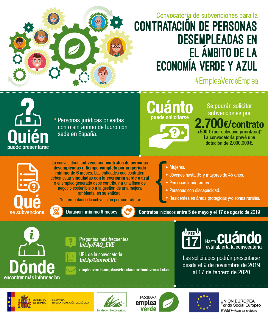 Esta convocatoria, cofinanciada por el Fondo Social Europeo, se enmarca dentro del Programa empleaverde, que tiene como objetivo impulsar la sostenibilidad de las actividades económicas en todos los sectores, promoviendo la transición justa hacia una economía baja en carbono y circular, integrando la biodiversidad en la gestión y procesos empresariales y haciendo un uso más eficiente de los recursos naturales, constituyendo un motor de crecimiento económico sostenible y de progreso social.