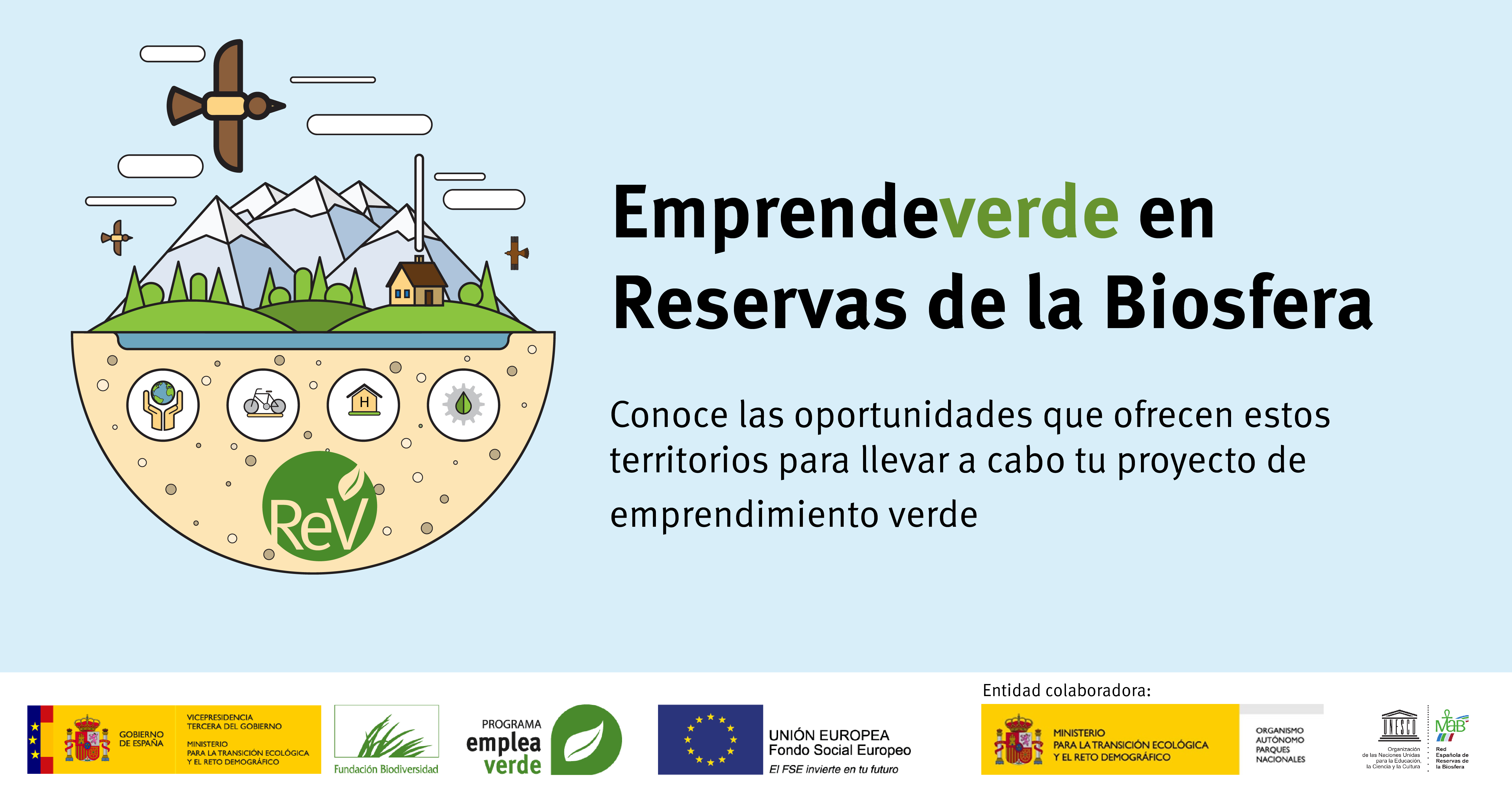 La Fundación Biodiversidad del Ministerio para la Transición Ecológica y el Reto Demográfico, con la colaboración del Organismo Autónomo Parques Nacionales (OAPN) y la Red Española de Reservas de la Biosfera (RERB), pone en marcha “Emprendeverde en Reservas de la Biosfera”, un ciclo de actuaciones de apoyo a la creación de nuevos emprendimientos verdes en estos territorios. Este ciclo formativo de la Red Emprendeverde, cofinanciado por el Fondo Social Europeo, está dirigido a personas interesadas en aumentar sus competencias emprendedoras y aprovechar todas las oportunidades para emprender que ofrecen las Reservas de la Biosfera.