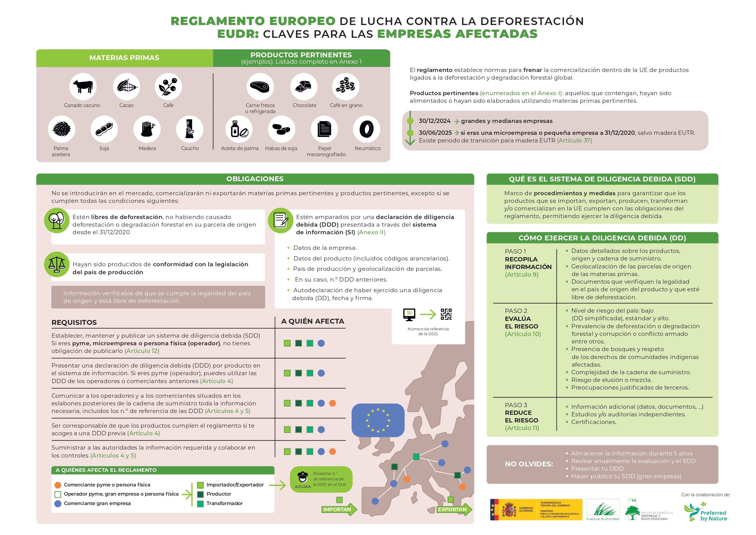 La Comunidad de Práctica de la IEEB ha lanzado esta infografía con dos premisas: dar a conocer los requisitos de los sistemas de diligencia debida a los que están obligadas algunas de las empresas afectadas por el Reglamento y recoger las inquietudes y necesidades al respecto para ver de qué forma la IEEB puede apoyarlas.