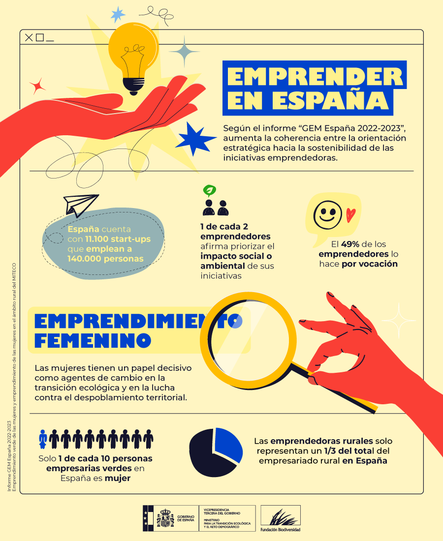 Según datos de Emprendimiento verde de las mujeres y emprendimiento de las mujeres en el ámbito rural del Ministerio para la Transición Ecológica y el Reto Demográfico, las mujeres tienen un papel decisivo como agentes de cambio en la transición ecológica y en la lucha contra el despoblamiento territorial. Sin embargo, solo una de cada diez personas empresarias verdes en España es mujer. A partir de microdatos de la EPA se estima que, en 2022 hay en España un total de 56.692 mujeres emprendedoras en actividades verdes y 534.595 hombres, lo que supone que las mujeres conforman solo el 9,6% del total del emprendimiento verde.